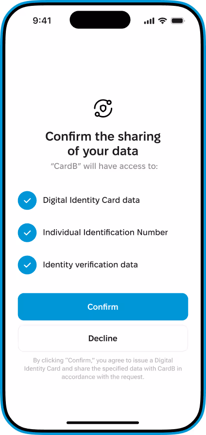Доступ к криптобиржам, кошелькам и другим платформам без лишних сложностей. Вместо прохождения долгих процедур вы просто в один клик подтверждаете шеринг своей Digital Identity Card.